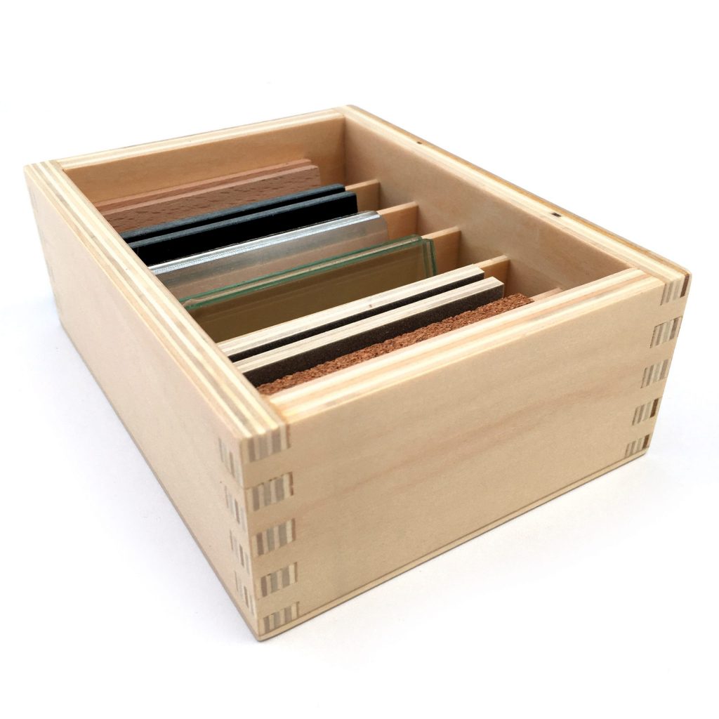 Consists of a wooden box divided into 6 compartments containing six pairs of 8 x 4 cm (3″ x 2″) tablets made from felt, wood, steel, cork, glass and marble.